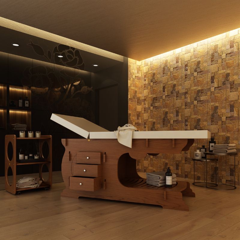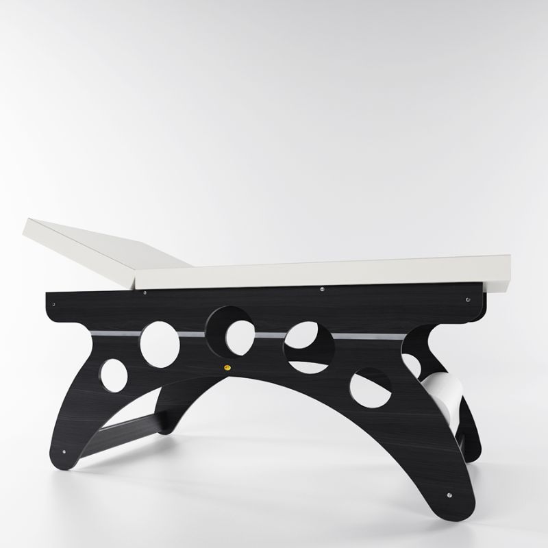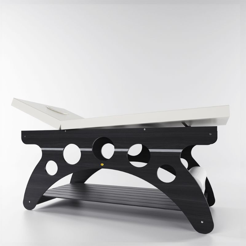 Realizzato in legno multistrato di betulla nella colorazione legno Wengè, completo di cuscineria in skai lavabile cucita sartorialmente in due colorazioni standard a scelta: Bianco o Beige. La struttura in legno è impreziosita da cerchi laterali che, oltre ad avere una funzione puramente estetica, possono anche essere utilizzati come porta asciugamani durante i trattamenti. Il lettino ATENE è corredato di testata regolabile grazie ad apposite cerniere in acciaio zincato e di un utilissimo porta rotolo.